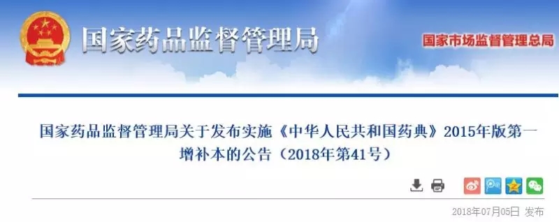 7月5日,國家藥監(jiān)局發(fā)布通告,《中華人民共和國藥典》2015年版第一增補(bǔ)本已編制完成。此增補(bǔ)本自2019年1月1日起施行。