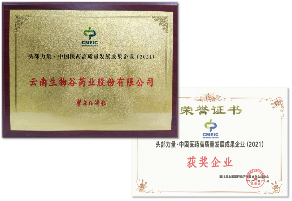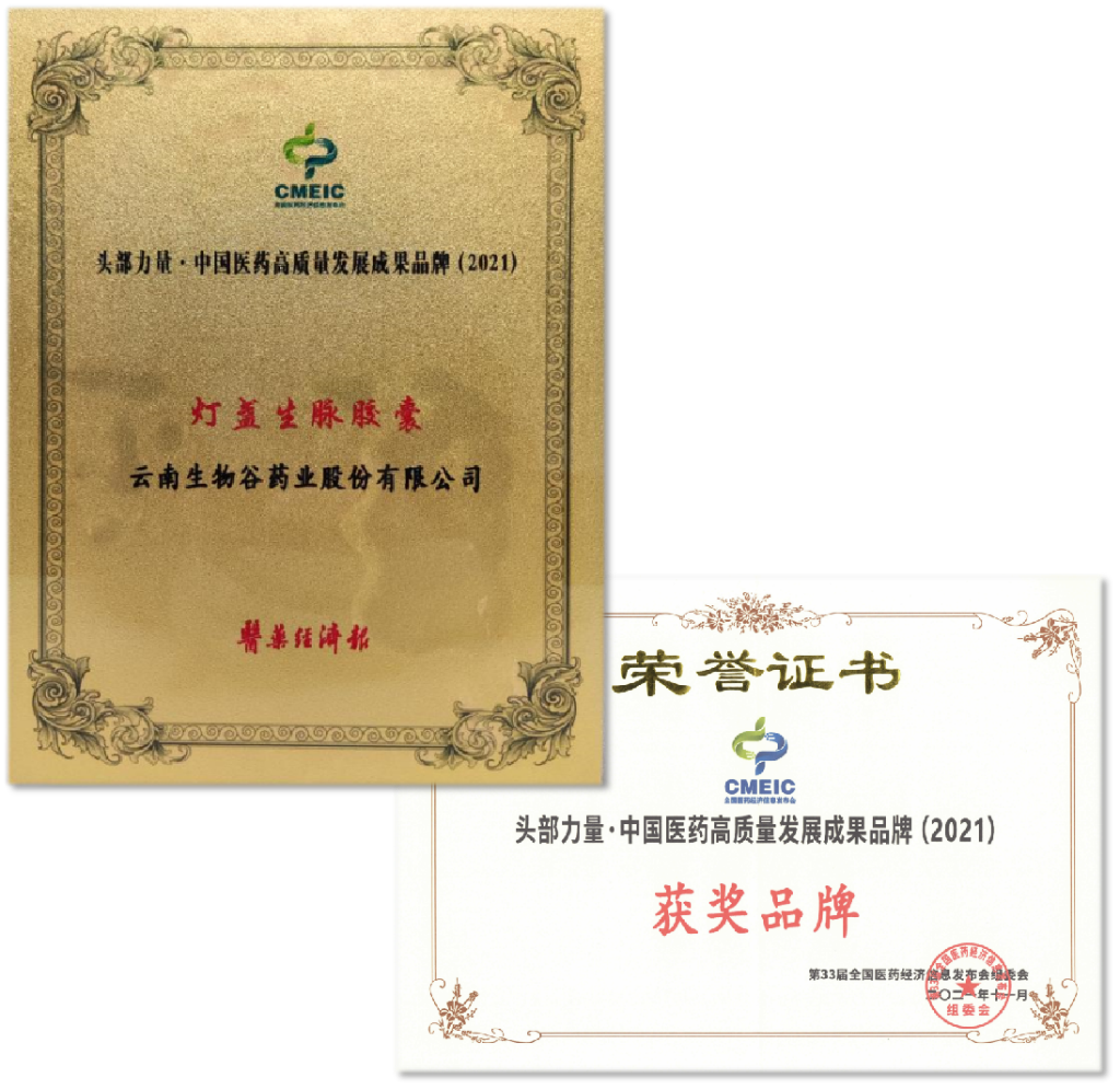 在本次高峰會議中,一并頒發(fā)了原定于2021年度11月份召開,因疫情原因延遲的第33屆(2021年度)全國醫(yī)藥經(jīng)濟信息發(fā)布會的行業(yè)頭部力量重磅獎項,云南生物谷藥業(yè)獲得“頭部力量·中國醫(yī)藥高質(zhì)量發(fā)展成果企業(yè)”榮譽,成為行業(yè)百強之一,公司產(chǎn)品燈盞生脈膠囊獲得“頭部力量·中國醫(yī)藥高質(zhì)量發(fā)展品牌”榮譽。
